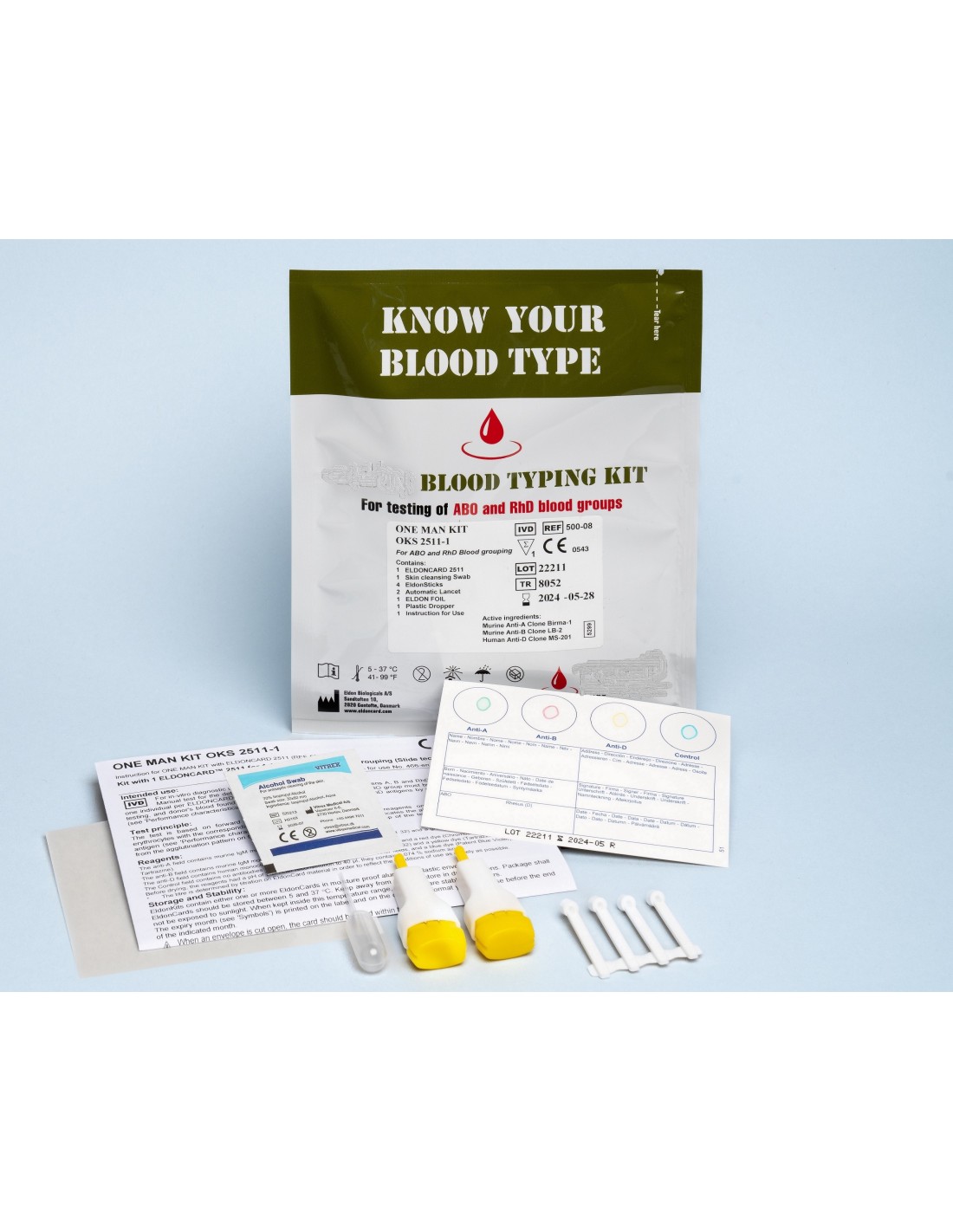 EldonCard vieno asmens rinkinys ABO ir RhD kraujo grupei nustatyti – patogus greitas kraujo grupavimo testas, skirtas ABO ir RhD kraujo grupės nustatymui medicinos bei skubios pagalbos situacijose.