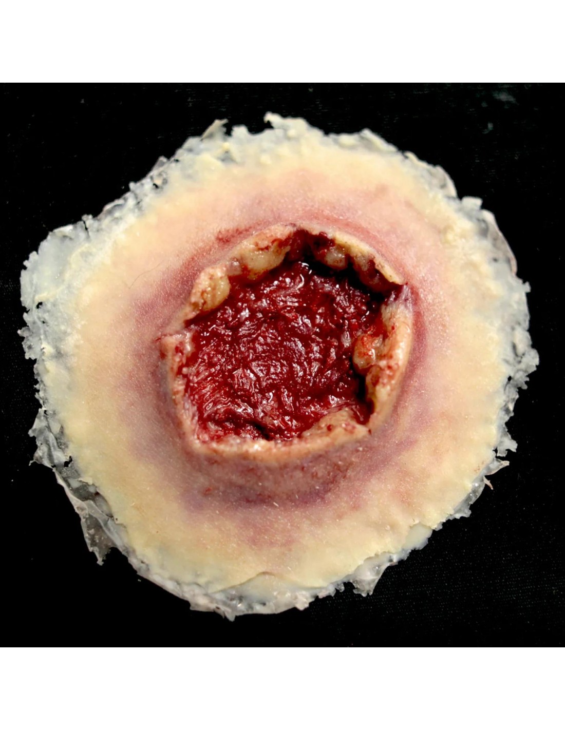 Didelė Šautinės (Išeinančios) Žaizdos Imitacija – tai lipni, daugkartinio naudojimo žaizda. Jei imitacija susitepa, ją pakanka nuplauti šiltu vandeniu su muilu – taip atnaujinamas lipnus pagrindas ir ji vėl paruošiama naudojimui.