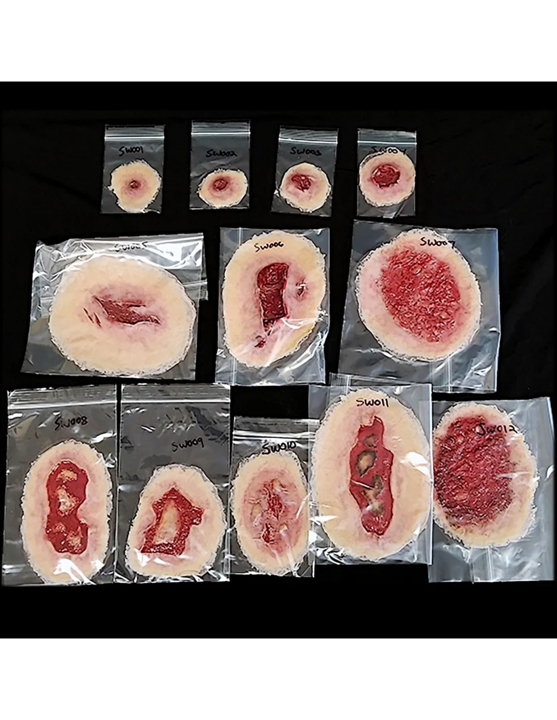 Mažas lipnių žaizdų rinkinys – praktiškas žaizdų simuliacijos komplektas, skirtas realistiškiems traumų scenarijams ir pirmosios pagalbos mokymams.